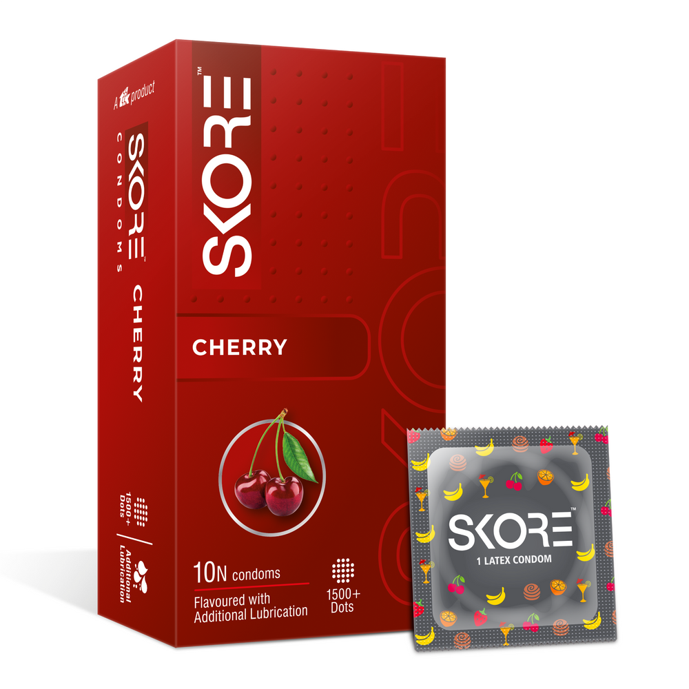With 1500+ dots, additional lubrication, and a tantalizing cherry flavor, SKORE Cherry offers absolute joy. It is made from natural rubber latex, and 100% electronically tested for safety. The red-colored condoms, measuring 180mm in length and 53+/-mm in width, ensure a perfect fit.